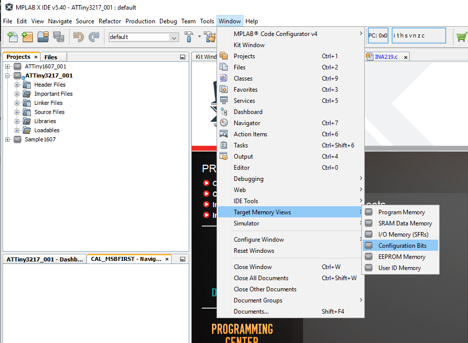 The usage of the MPLAB X IDE did not feature much in this report. Overall it worked very well and the MPLAB Code Configurator (MCC) was useful in setting up the pin usage and generating some base code for TWI and USART. The MCC is somewhat similar to the Atmel Start configurator. One area that took some working out was the setting of the Fuse Bits. In Atmel Studio 7, this is a part of the programmer dialog. For MPLAB X, this is reached via the Windows -> Target Memory Views -> Configuration Bits