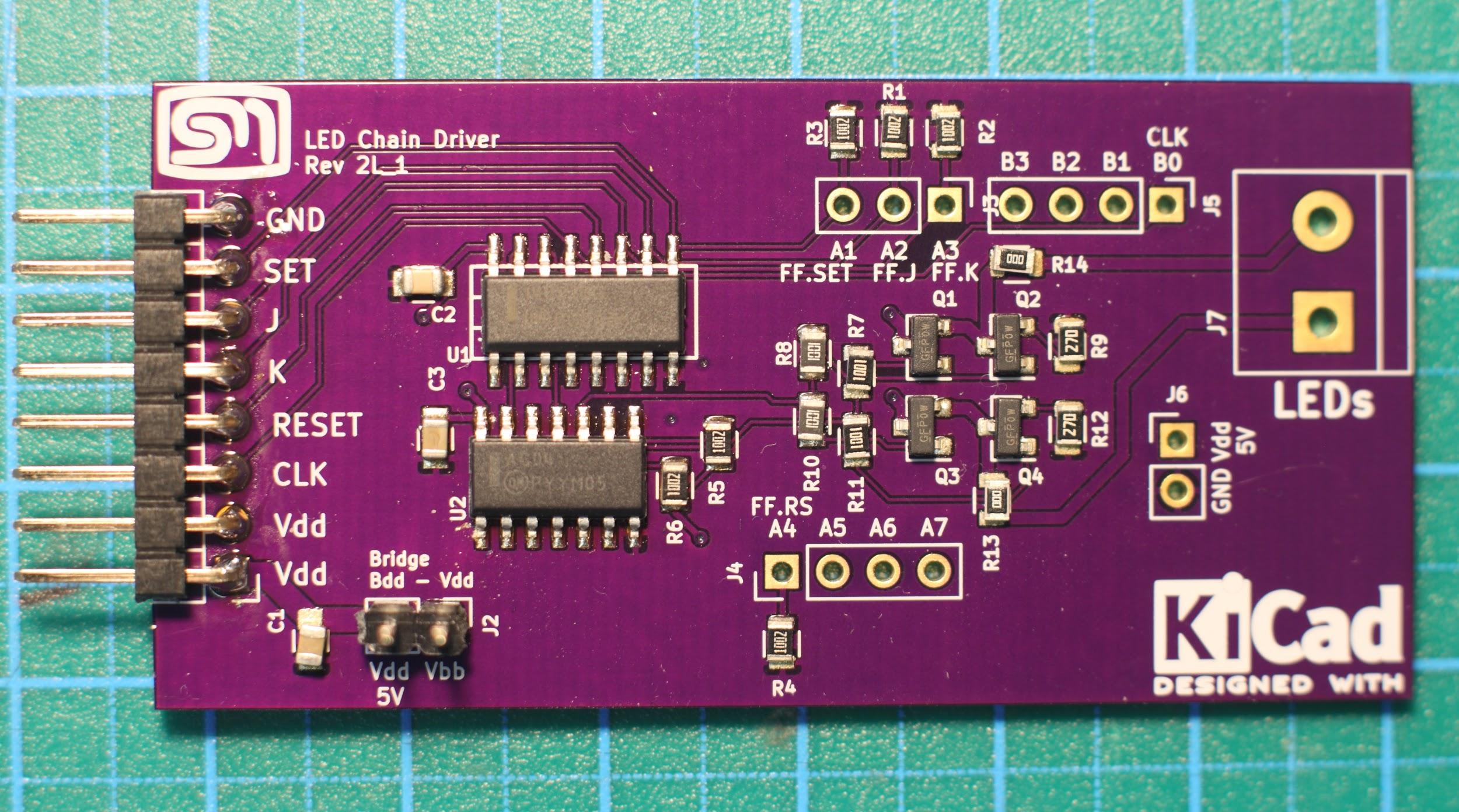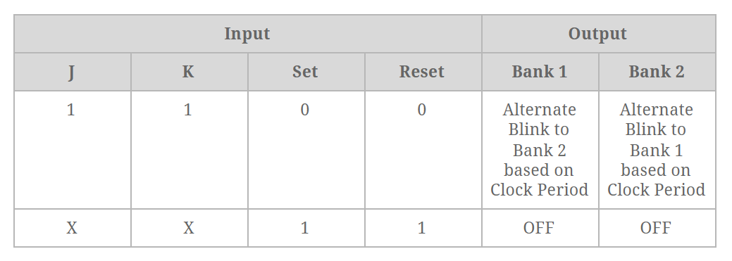 The behaviour of the LEDs could be influenced by manipulating the J, K , SET and RESET pins as shown in Table 1.