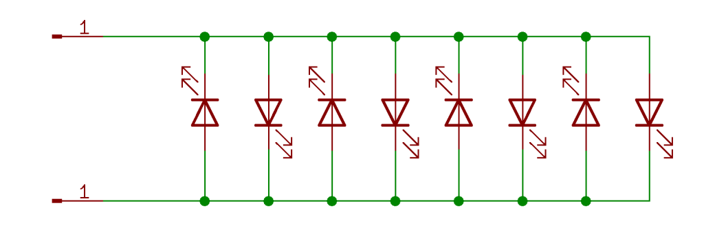 I was concerned about the current through the resistors. I was thinking that the current should be limited to a maximum of 10 mA. The LEDs in use have a voltage drop of 1.83 V. Since the the LEDs are all in parallel, it was assumed that the total current drawn would be 10 mA ✕ n LEDs. i.e. For 10 LEDs, this would come to an expected a maximum current draw of 50 mA – 5 LEDs on each bank. Only one bank is ever active at one time.