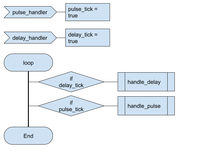Figure 4. depicts a part of the algorithm where the respective interrupt handler routines set a flag. These flags are checked in the main loop. When “delay_tick” is set to true, then the delay handler is called. The delay handler is responsible for monitoring the length of time an effect is running for and for selecting a new effect when the time has expired. The new effects are randomly selected as is the duration. The effect selected would dictate what the pulse timer should be set to i.e. 5Hz, 10Hz or 100Hz. The pulse timer handler, called when the pulse_tick is set to true, is responsible for the setting of the intensity of the LED via the PWM value and enabling the appropriate LED bank.