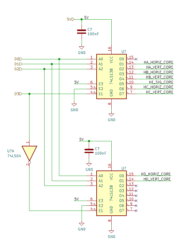 The technique using the encoders and decoders cascades the 74LS138 ICs in such a way that they can be driven with four lines to achieve 16 channels. Because of the way in which the decoder works, I did not want to use output Q0. This is active when the 4 input lines are low. I.e. it represents a 0 and so the Q0 line is low.