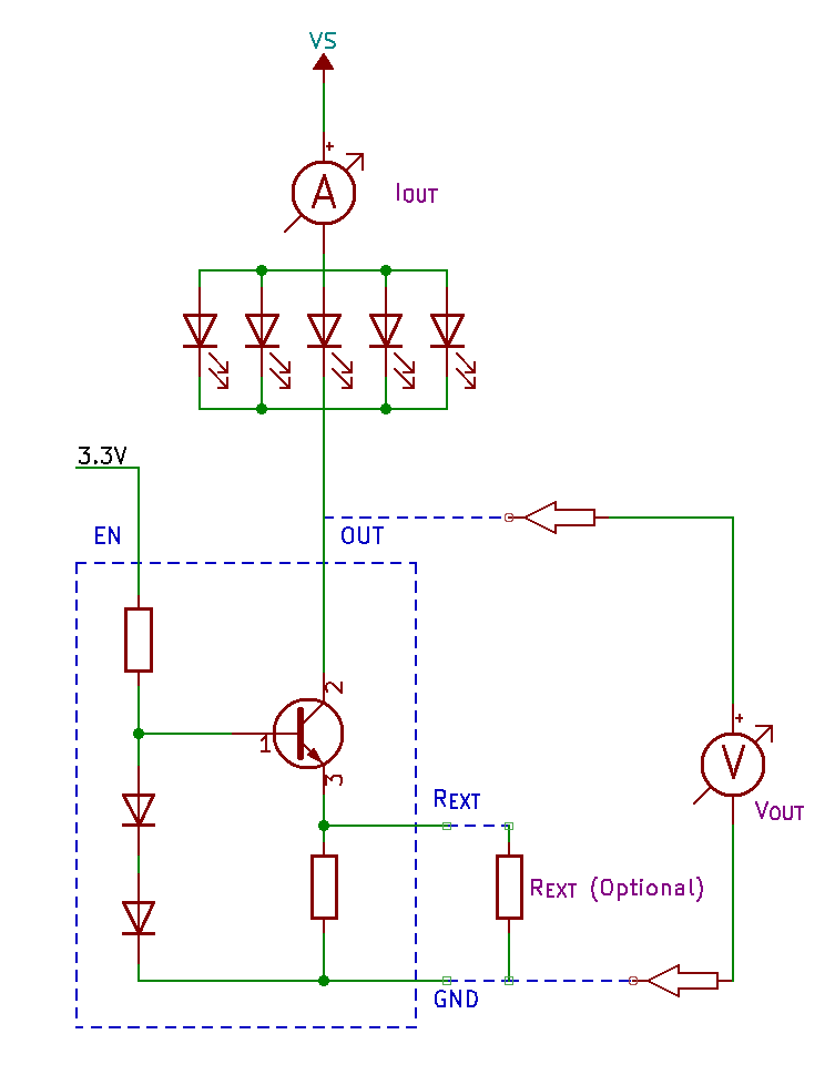 For testing the use of the external resistor, schematic 3 was used whereby five LEDs were connected to VOUT in parallel.