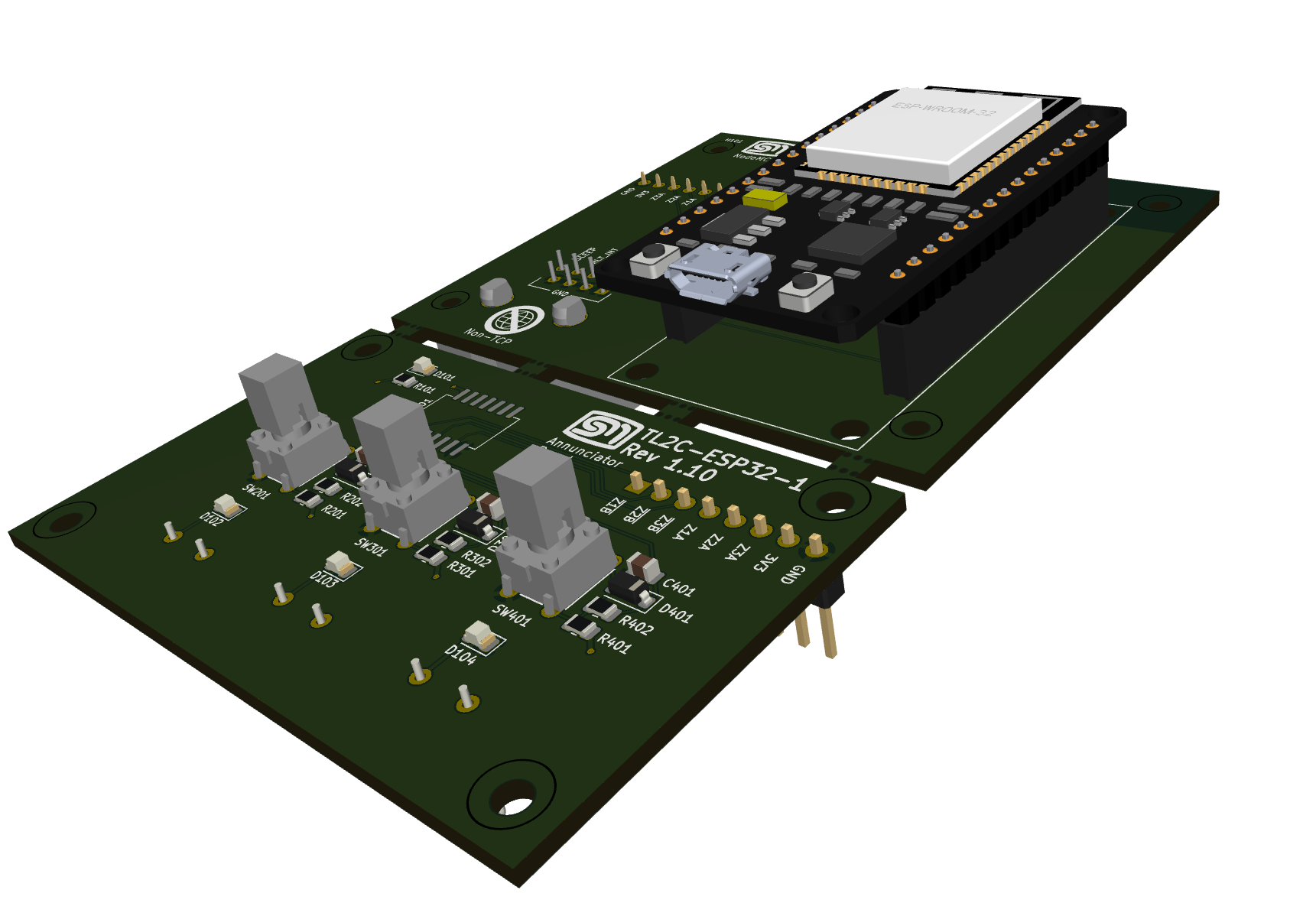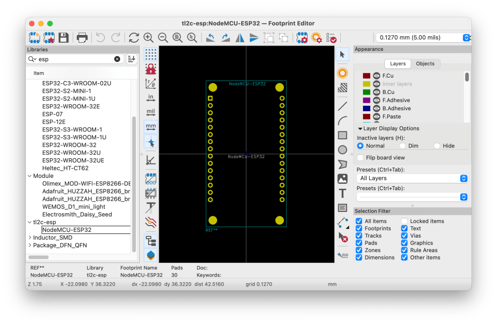 In this example, I created the footprint as normal to model the pin headers for the NodeMCU ESP-32. I then source a 3D model of the 3rd party board in question. One source I use is GrabCad. If I can’t locate what I am looking for then I will use FreeCAD to create my own.