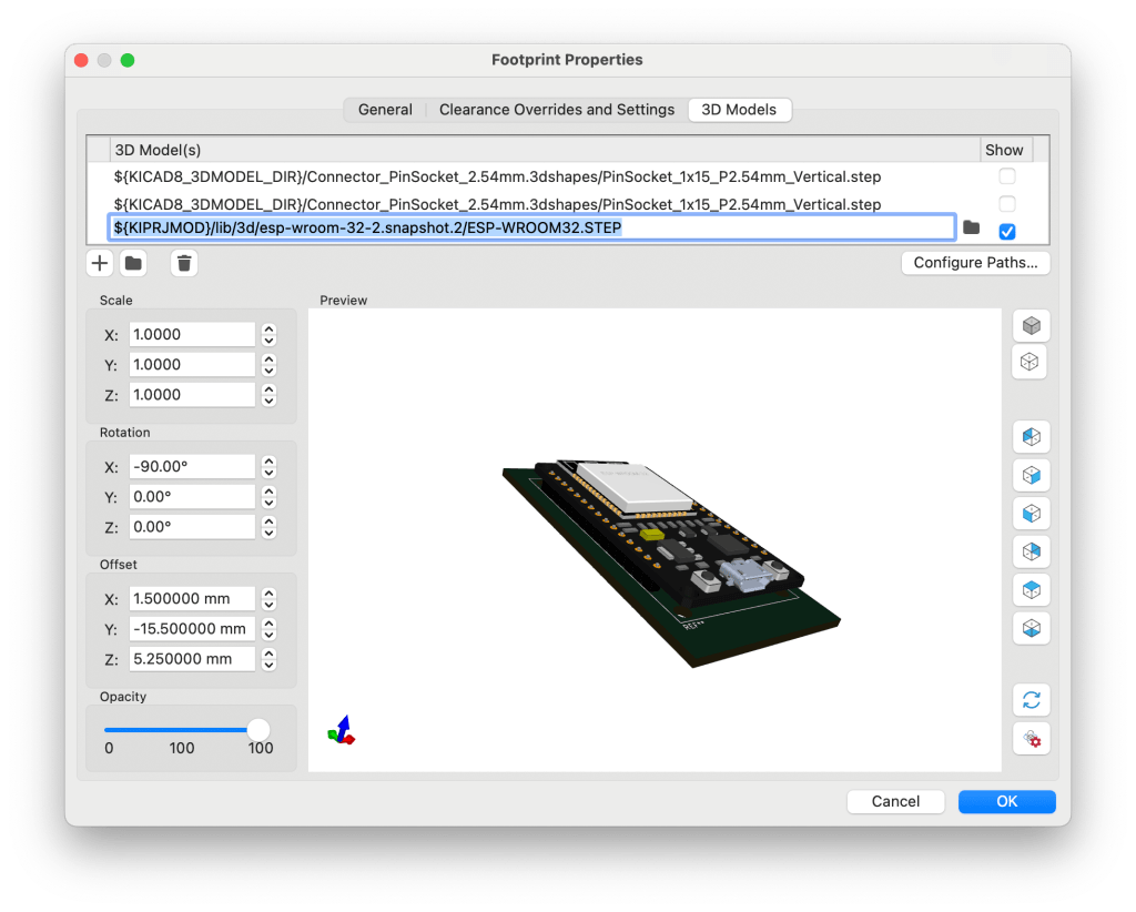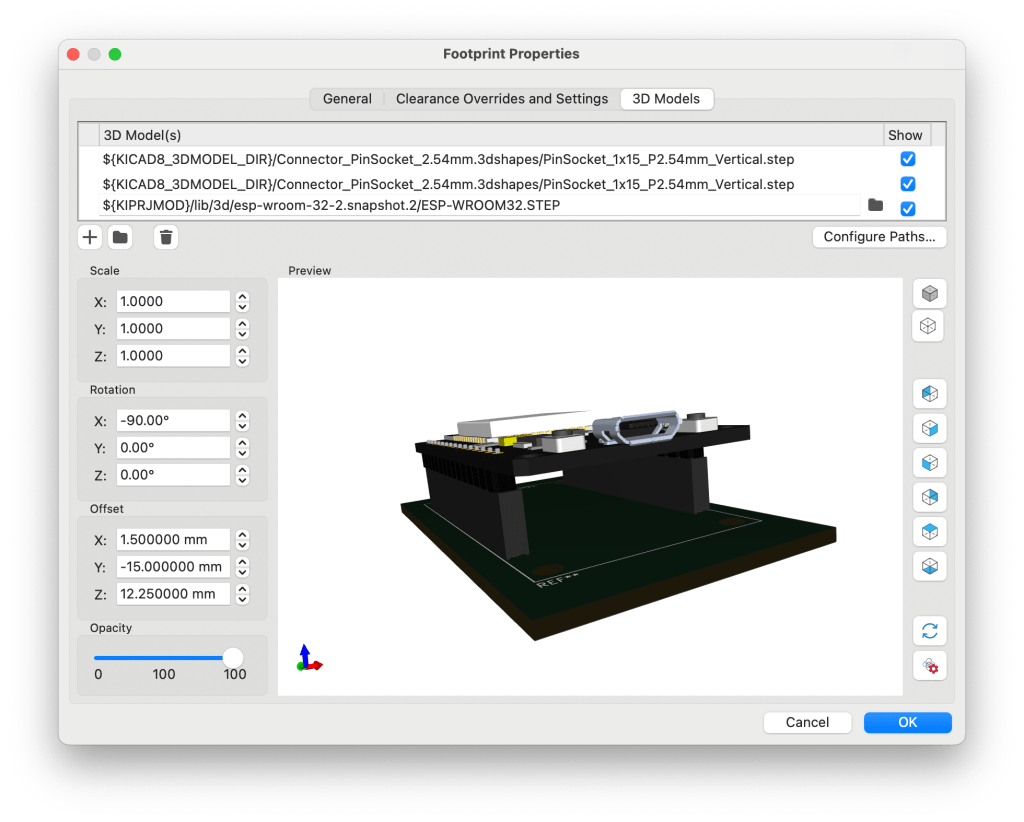 . Check the files stored at the directory pointed to by ${KICAD8_3DMODEL} for something suitable e.g. pin headers etc. It is usual then to set the Scale, Rotation and or offset to position the 3D model to the desired position on the footprint displayed on the board. KiCad allows you to define multiple 3D models. They can be selected or deselected for display as required. In this example, I used this technique to explore what it would be like to use pin headers rather than soldering the NodeMCU board directly to my project.