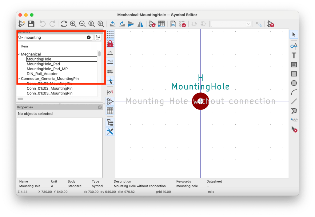 ![]() | A place holder for a mounting hole. A symbol is needed for each mounting hole to be modelled on the board. |