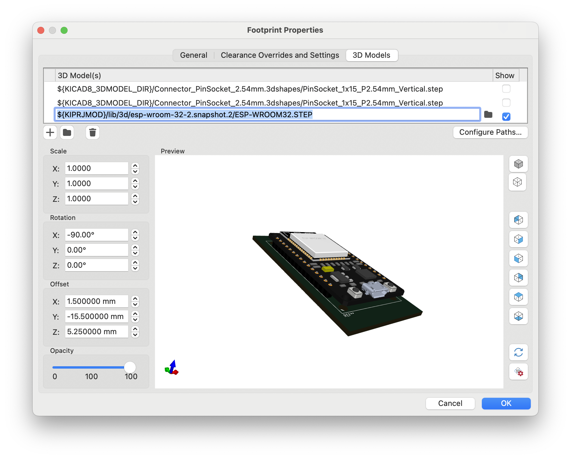. Check the files stored at the directory pointed to by ${KICAD8_3DMODEL} for something suitable e.g. pin headers etc. It is usual then to set the Scale, Rotation and or offset to position the 3D model to the desired position on the footprint displayed on the board. KiCad allows you to define multiple 3D models. They can be selected or deselected for display as required. In this example, I used this technique to explore what it would be like to use pin headers rather than soldering the NodeMCU board directly to my project.