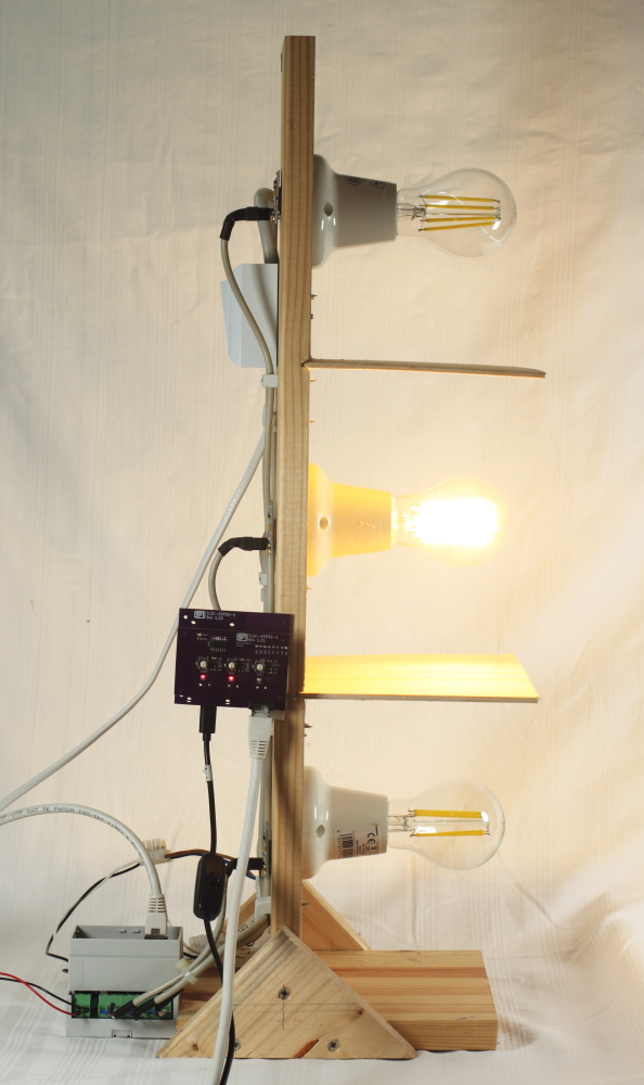 I was able to use the test harness that I had created for the original project. It is fitted with three sets of PR13 sensors and lamps. A baffle between each lamp/PR13 set simulates the three zones I want to control. I also had a spare TL2C LED controller unit that was used in the development of the original project. With this configuration I could easily test the behavior of the User Interface as it reacted to the TL2C events.
