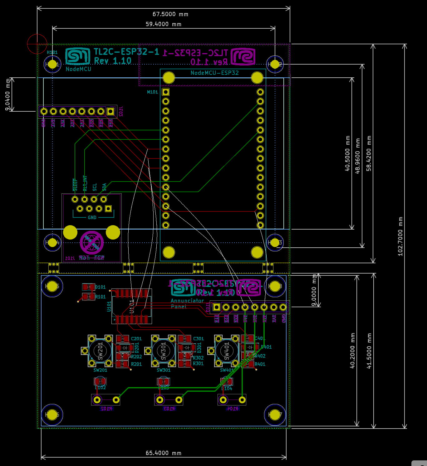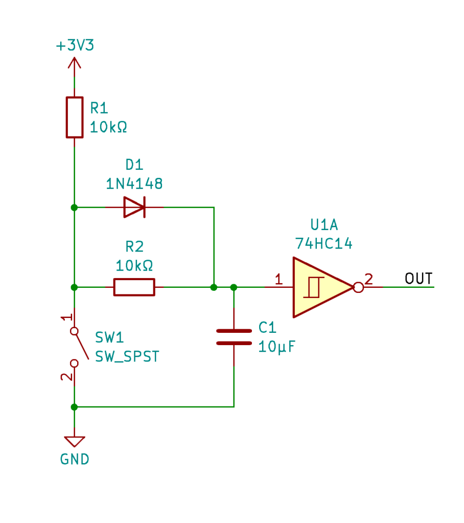 As mentioned in the design constraints, I wanted to provide de-bounce in hardware rather than in firmware so that the so firmware could be dedicated to handling the I2C events and rendering the user interface. The circuitry for this was placed a board that would connect to the board containing the NodeMCU, so that the buttons and indicator LEDs could be exposed and accessible through the front panel.