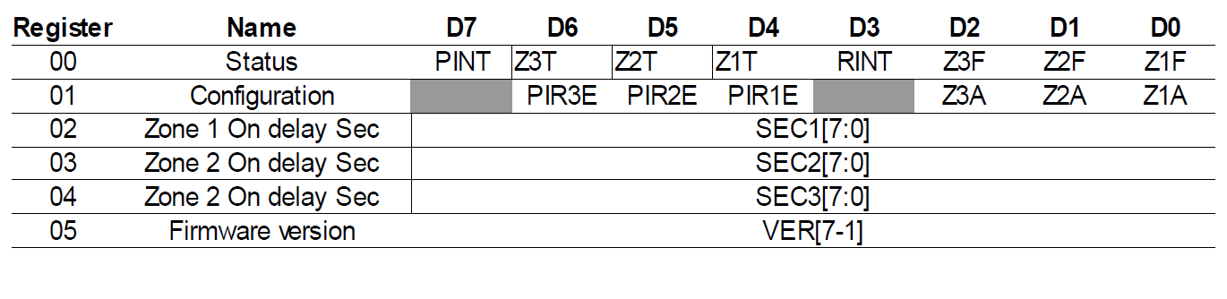 There are six registers. Two of the registers are read only and three are read/write. Register 0 (read-only) provides the status information. Registers 1 to 4 define the configuration information (read/write). Register 5 (read only) provides the firmware version.