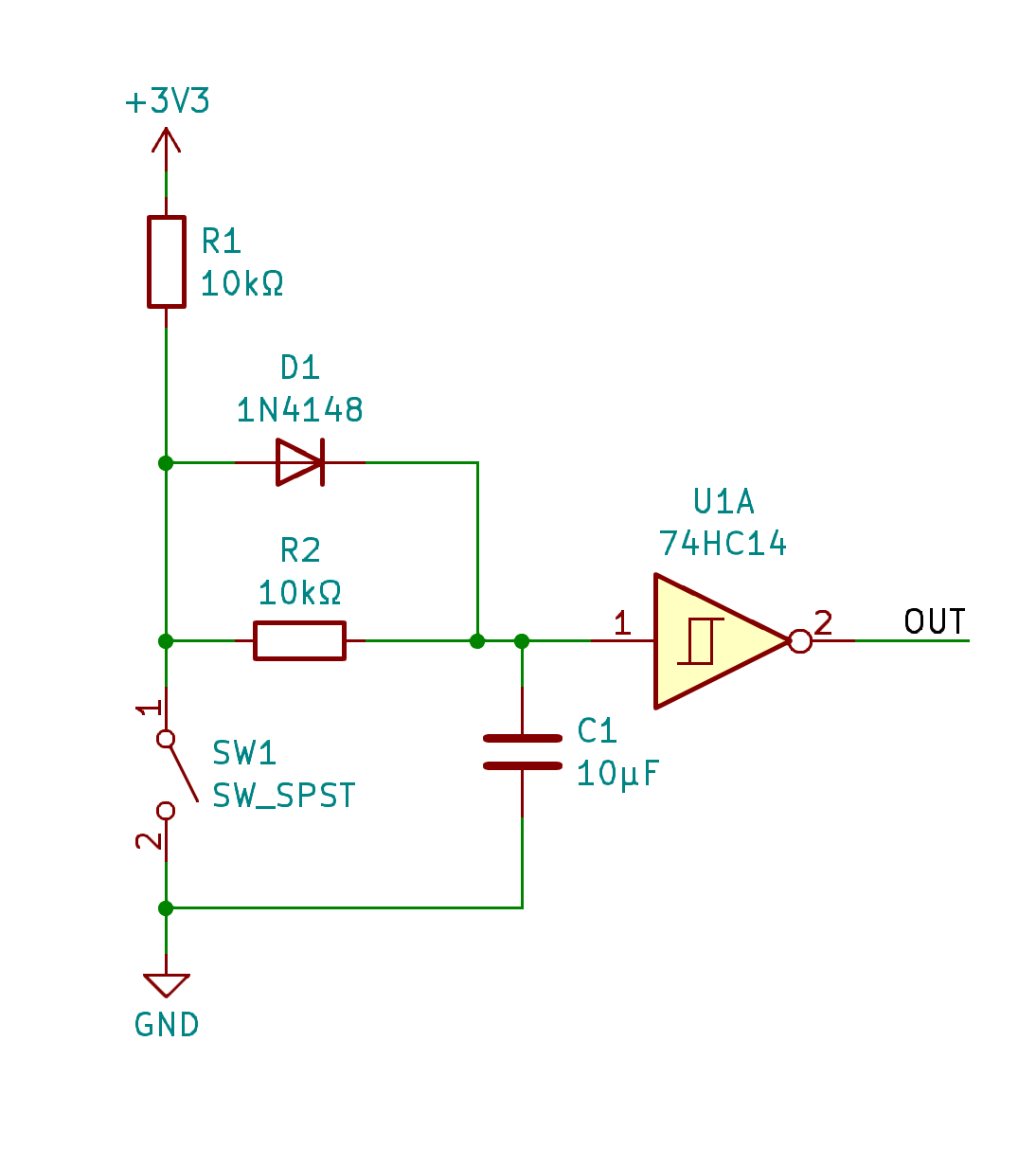 The schematic is relatively simple in that it focuses on the use of a NodeMCU module containing an ESP32 with connection to support I2C and GPIO for the interrupt and proposed sleep signals. The introduction of buttons also brings on the age old issue of de-bounce. Since this project is for me I decided to factor in the additional cost and to mitigate de-bounce with a hardware solution rather than in software. I found a suitable example and proceeded to build it up on bread board to verify the respective values of the components.