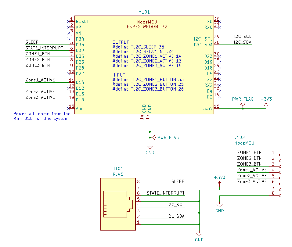 Ideally, the PCB would be a pin-header to accept the NodeMCU module and an RJ45 to connect to the LED control module. But my design constraints stipulated that this needed to fit into a DIN rain compatible enclosure such as the Camdenboss CNMB/3/KIT. In order to achieve this I created the design on two levels: A top board would hold the zone buttons and indicator LEDs. This would be nearer the front panel of the enclosure and would plug into a base board that would contain the NodeMCU module and RJ45 connector.
